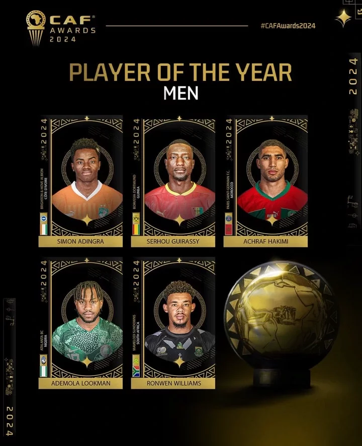 Ademola Lookman has been a standout with his flair and goal-scoring prowess for both club and country, while Achraf Hakimi, ever a fixture in elite football circles, continues to dominate with his defensive resilience and attacking prowess down the right flank. Simon Adingra has been a revelation this season, Nico Williams has earned praise for his technical brilliance and consistency, and Serhou Guirassy’s red-hot form in front of goal has propelled him into contention as one of Africa’s top footballers.