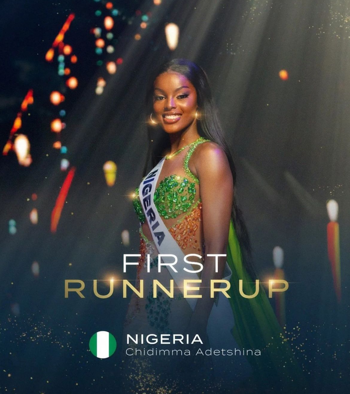 This historic win makes Adetshina the first-ever Miss Universe Nigeria to claim a spot in the top two of the prestigious pageant—a groundbreaking moment for Nigeria and the continent.
