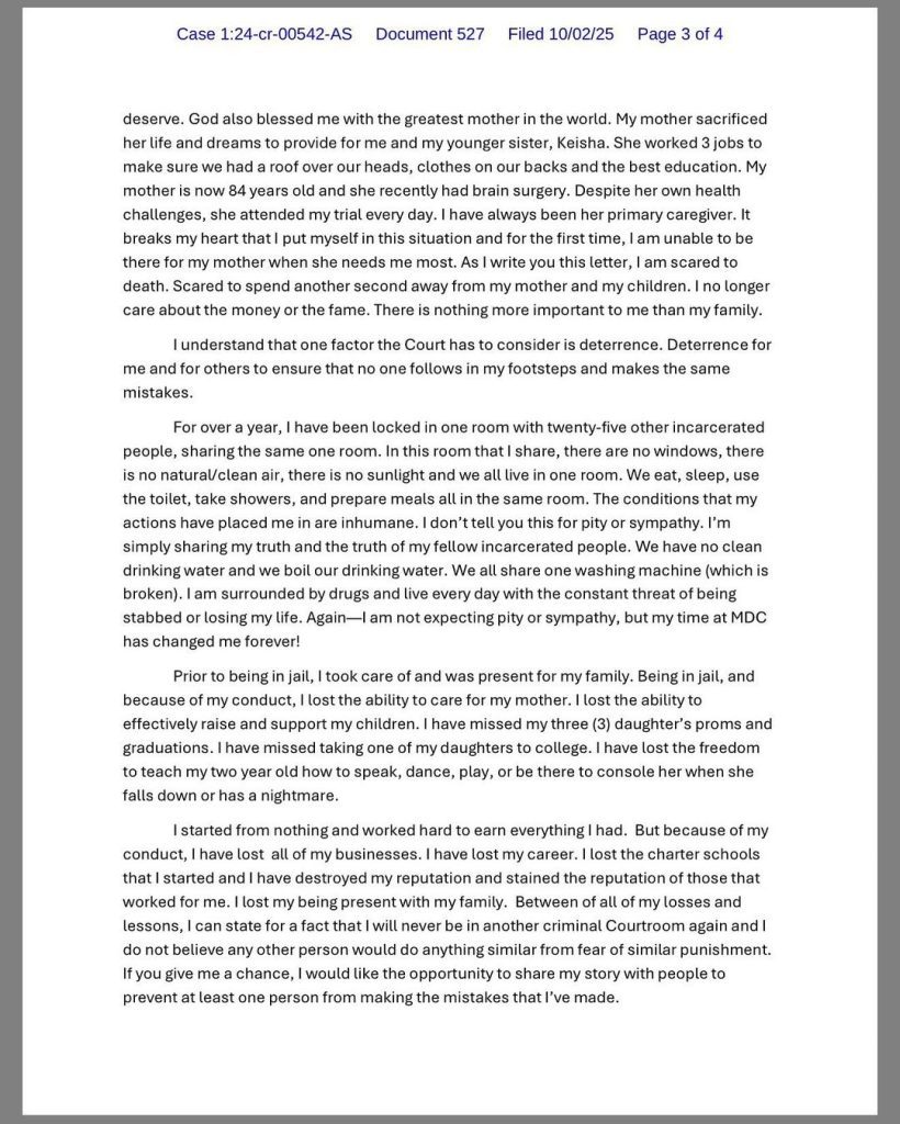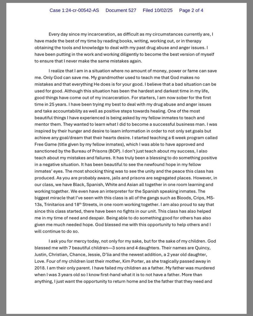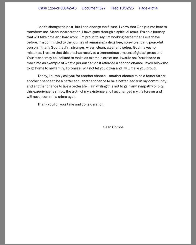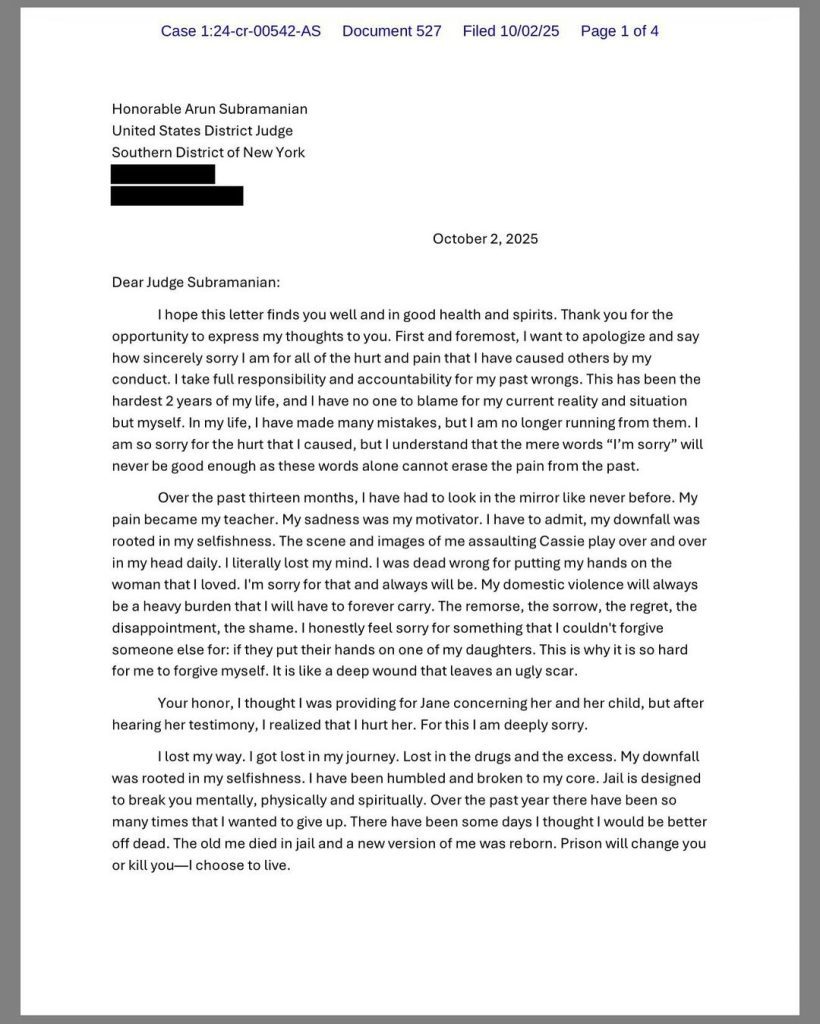 Sean “Diddy” Combs submitted an apologetic letter to Judge Arun Subramanian on Thursday, October 3, 2025, expressing “how sincerely sorry I am for all of the hurt and pain that I have caused” ahead of his sentencing hearing Friday in Manhattan.