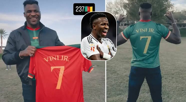 Taking to Instagram, Ngannou shared a photo of himself wearing a Cameroon national team jersey, customized with Vinícius Júnior’s name. Alongside the image, he wrote,