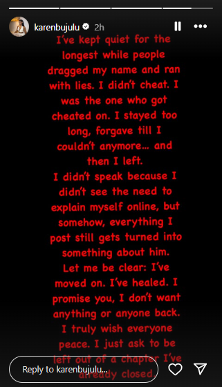 Her statement comes months after her quiet split from Jux, who recently made headlines after marrying Nigerian influencer Priscilla Ojo. While Jux has yet to respond, Karen’s candid post has sparked fresh conversations online, with fans applauding her maturity, grace, and choice to reclaim her narrative.