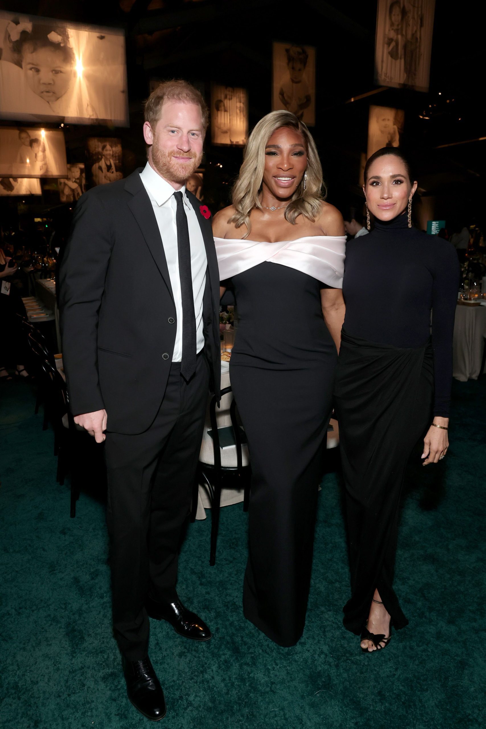 The Duke and Duchess of Sussex skipped the red carpet but were photographed inside the event posing alongside Williams, who dazzled in an elegant black and white gown. Meghan opted for a sleek, monochromatic custom Balenciaga gown featuring a high neckline and dramatic thigh-high slit, while Prince Harry wore a classic tuxedo, completing the look with a red poppy in observance of Remembrance weekend.