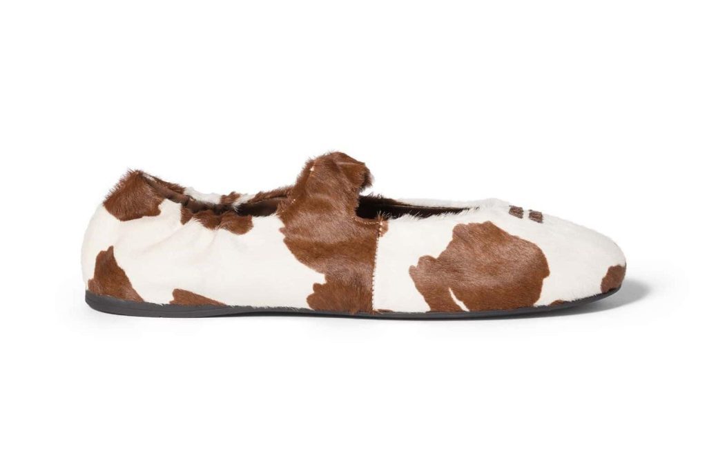 In contrast, the Miu Miu Holiday 2025 Shoes collection also features the ultra-flat ballet silhouette in a statement-making cow print. The Cow Pattern Leather Ballet Flats disrupt the feminine form, injecting a playful, punk-infused sensibility that embraces bold contrast. This juxtaposition of an innocent shape with an audacious pattern is key to Miu Miu’s modern, confident aesthetic.