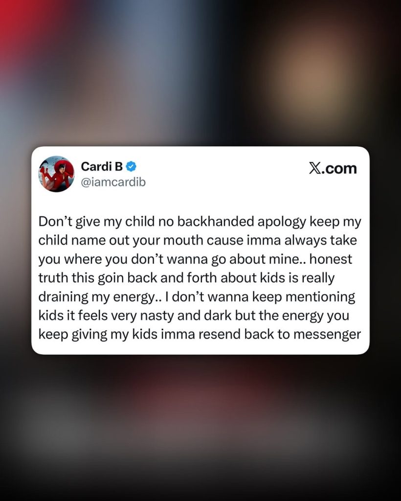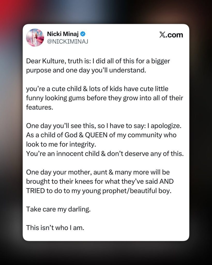 In a message posted to X, Minaj wrote “Dear Kulture, you’re an innocent child & don’t deserve any of this. One day you’ll understand.” The apology came after both rappers exchanged heinous personal attacks that included mocking each other’s kids, crossing boundaries that fans across social media criticized as unacceptable.