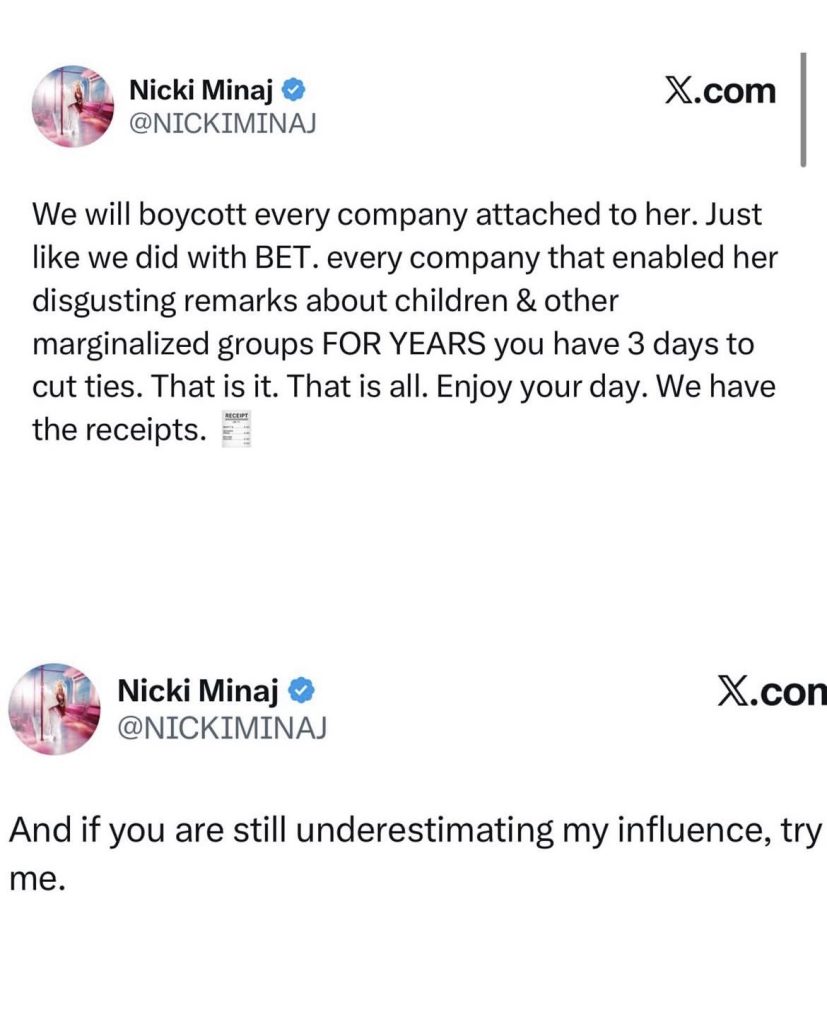 In a series of posts on X, Minaj addressed her loyal fanbase known as the Barbz, stating “We will boycott every company attached to her.” The demand came amid an explosive social media war between the two rappers that has spilled into threats against Cardi B’s brand partnerships and endorsement deals.