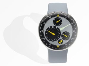 Newson focused on an updated palette for the display, utilizing a subdued yet striking combination of celadon green, light grey, black, and contrasting vibrant yellow accents on the thermal gauge and minute markers. The hands are simplified to their most essential forms, creating unparalleled legibility and paying homage to his early, minimalist watch designs while showcasing the watch’s complex orbital movement.
