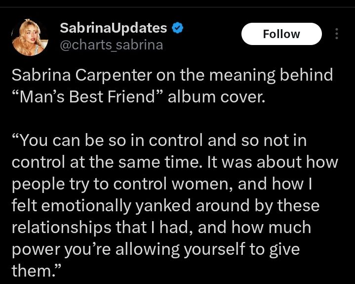 Carpenter told the outlet, “It was about how people try to control women, and how I felt emotionally yanked around by these relationships that I had, and how much power you’re allowing yourself to give them.” She explained that her seemingly inscrutable expression in the photo was meant to illustrate that a woman “can be so in control and so not in control at the same time.”