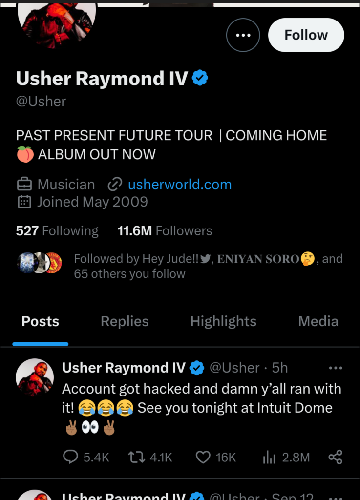 Upon the return of his account, Usher, 45, addressed the situation with a post on Sunday, September 22, writing, “Account got hacked and damn y’all ran with it! See you tonight at Intuit Dome.” However, many X users were not convinced, with some claiming that the deletion was too coincidental given Diddy’s arrest.
